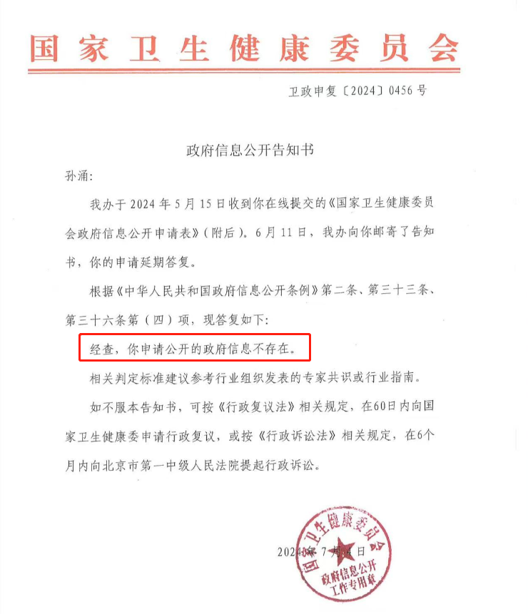 今年7月4日,国家卫健委向孙涌出具《政府信息公开告知书》,该告知书称,“经查,你申请公开的政府信息不存在。”该告知书还提到,相关判定标准建议参考行业组织发表的专家共识或行业指南。