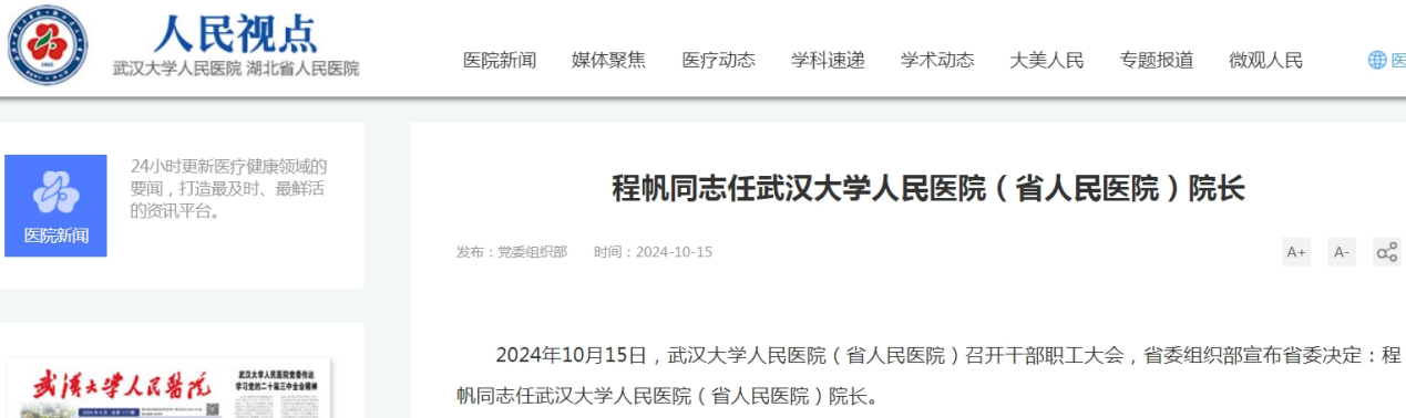 2024年10月15日,武汉大学人民医院(省人民医院)官网、武汉大学中南医院官网发布院长履新人事消息。