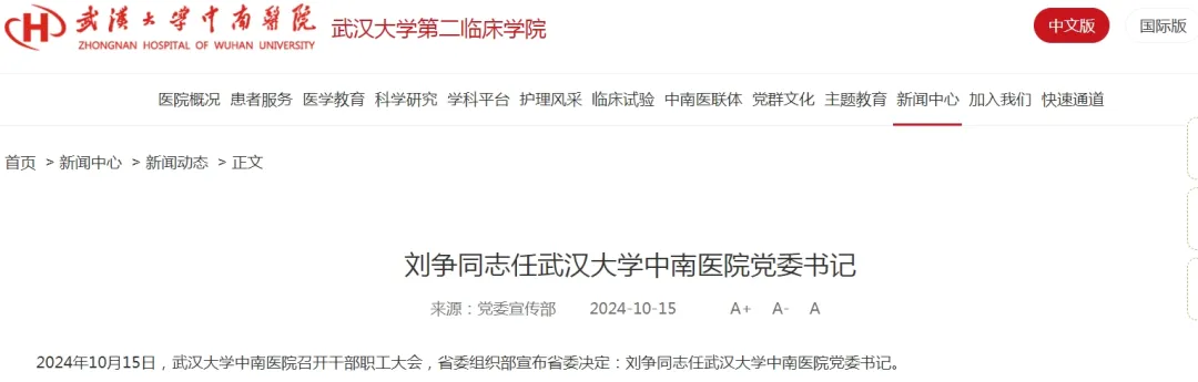 2024年10月15日,武汉大学中南医院召开干部职工大会,省委组织部宣布省委决定:刘争同志任武汉大学中南医院党委书记。
