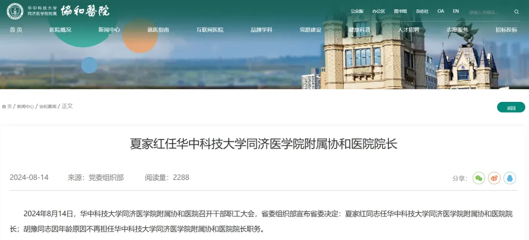 2024年8月14日,华中科技大学同济医学院附属协和医院召开干部职工大会,省委组织部宣布省委决定:夏家红同志任华中科技大学同济医学院附属协和医院院长。