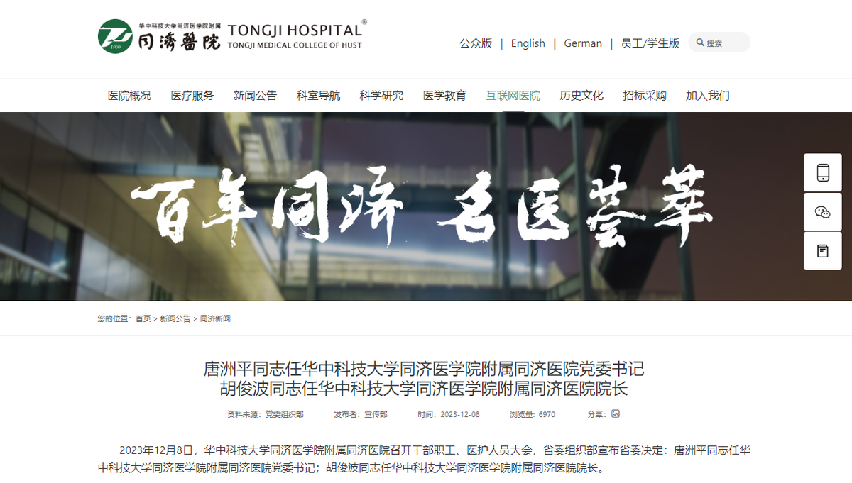 2023年12月8日,华中科技大学同济医学院附属同济医院召开干部职工、医护人员大会,省委组织部宣布省委决定:唐洲平同志任华中科技大学同济医学院附属同济医院党委书记;胡俊波同志任华中科技大学同济医学院附属同济医院院长。