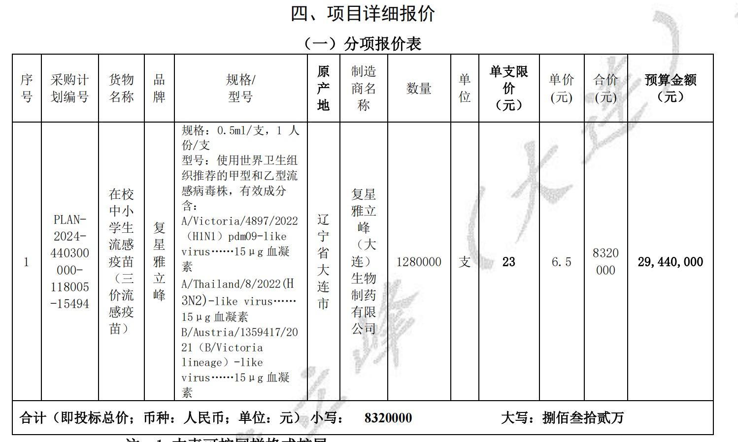 10月16日,深圳政府采购网公布了深圳市疾病预防控制中心2024年在校中小学生三价流感疫苗采购中标结果。值得一提的是,竞标公司之一的复星雅立峰的报价已低至6.5元/支,创历史最低报价。