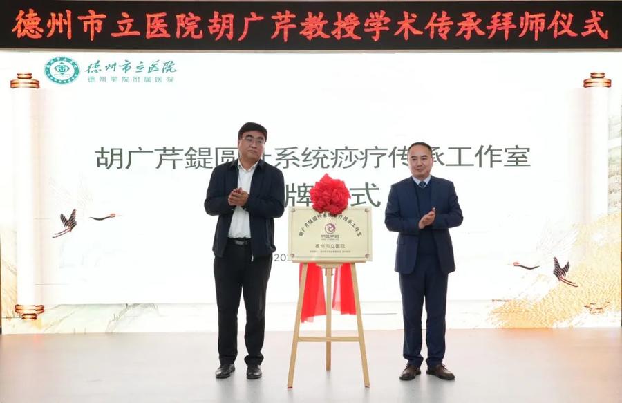 德州学院健康医学院党委书记张荣明与德州市立医院党委书记、院长冯丙树共同为“胡广芹鍉圆针系统痧疗传承工作室”揭牌。