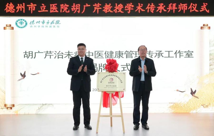 仪式上,德州学院党委副书记张存峰与市卫健委党组成员、副主任孔祥勇共同为“胡广芹治未病中医健康管理传承工作室”揭牌。