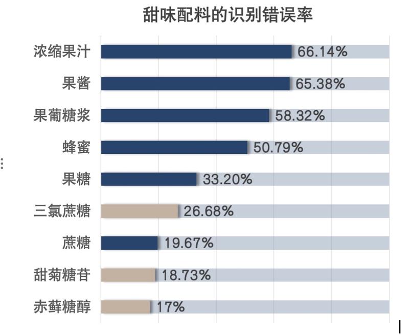 不过,消费者却不能精准识别“糖”,上述报告显示,能准确识别含糖配料的消费者不足10%。如蔗糖的识别正确率仅有80%左右,常用的果葡糖浆、蜂蜜、浓缩果汁、果酱的识别正确率均不足50%。有趣的是,还有不少消费者将不提供能量或仅提供较少能量的甜味剂(代糖)识别为含糖配料。