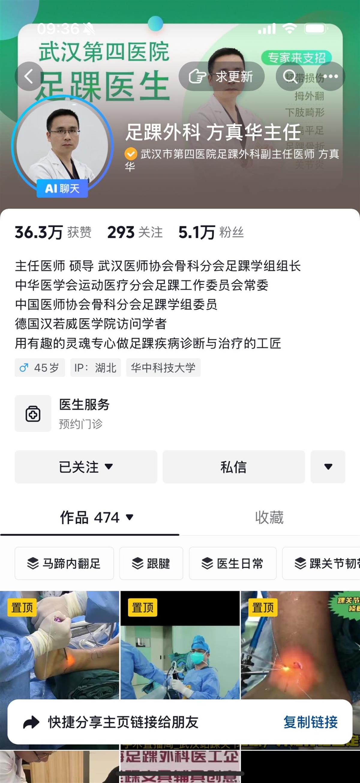 “方主任,我术后怎么锻炼?”“我是扁平足,能先做个小手术把疼的地方治好,不改变足弓力线吗?”“我走路总会脚疼,买什么样的鞋子比较好?”在方真华的门诊,他经常听到患者各式各样的询问,久而久之,他把常听到的问题汇总,趁休息时拍摄短视频解答。从2022年6月正式发布第一条视频,他的抖音账号至今已有5.1万多粉丝,而他患者的将近四分之一都是通过抖音找到他。