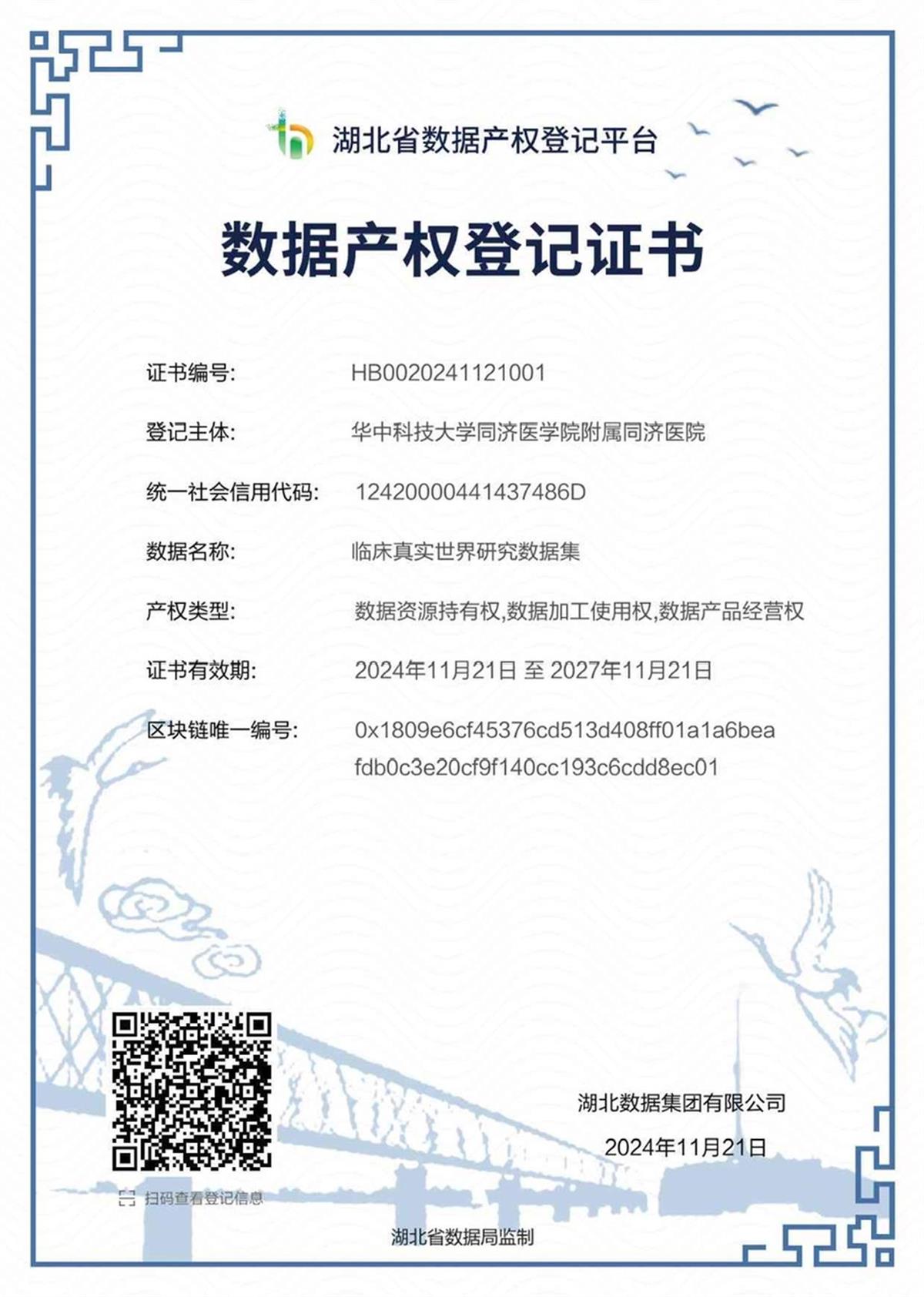 继11月20日获得湖北省知识产权局颁发的《数据知识产权证书》后,11月21日,同济医院又荣获湖北省数据局监制、中部数据流通服务中心颁发的湖北省事业单位首张《数据产权登记证书》,成为湖北省首家完成数据知识产权和数据产权凭证“双登记”的机构。