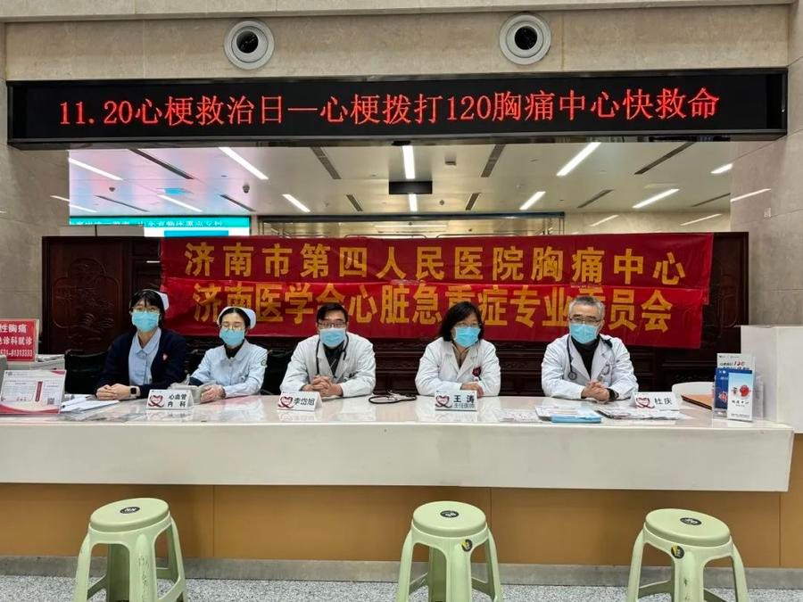 11月20日是“中国心梗救治日”,为提高公众对胸痛问题的关注,更好地普及胸痛相关知识,提升居民的健康意识,确保居民在出现心血管相关症状时能够及时发现并迅速就医,从而有效降低心梗的死亡率,11月20日上午,济南市第四人民医院胸痛中心医护团队在医院门诊大厅一楼开展了主题为“心梗拨打120,胸痛中心快救命”健康科普义诊活动。