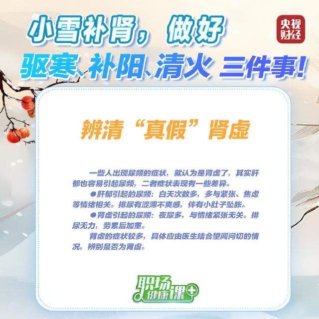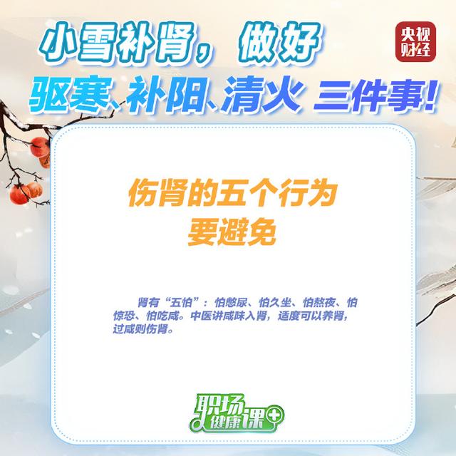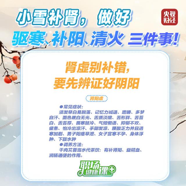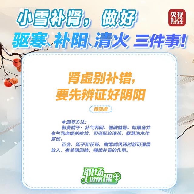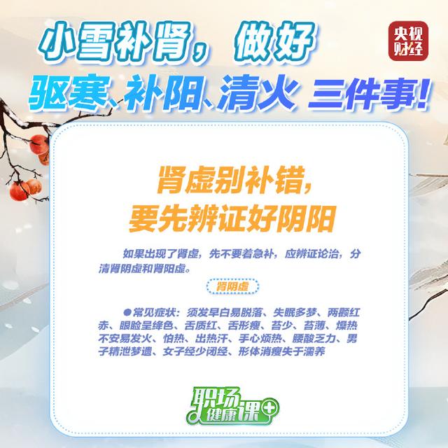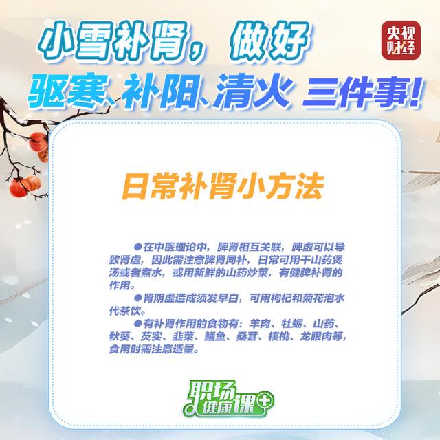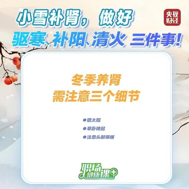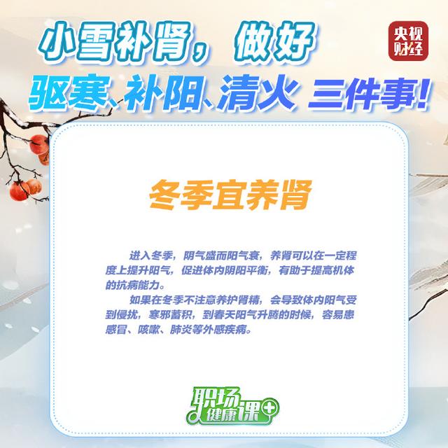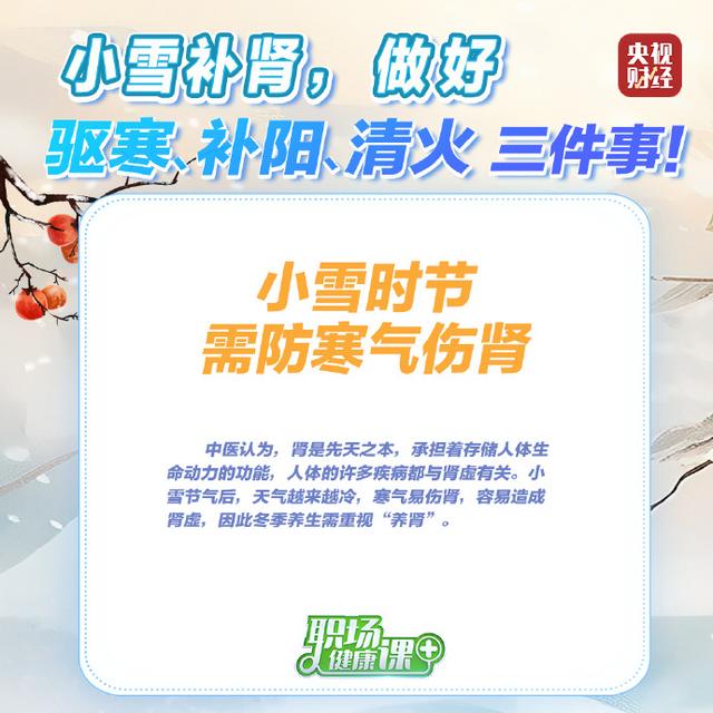 中医认为,肾是先天之本,承担着存储人体生命动力的功能,人体的许多疾病都与肾虚有关。小雪节气后,天气越来越冷,寒气易伤肾,容易造成肾虚,因此冬季养生需重视“养肾”。