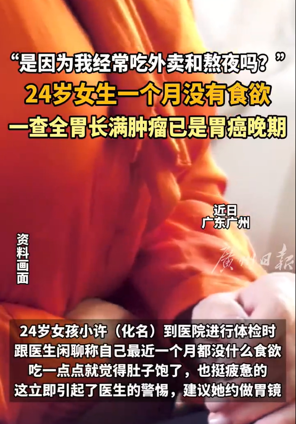 “医生,我最近一个月都没什么食欲,吃一点点就觉得肚子饱了,也挺疲惫的,不会有问题吧?” 临近年底,从事设计工作的24岁女孩小许(化名)到医院进行体检时,跟医生闲聊了几句。没想到这立即引起了医生的警惕,建议她约做胃镜查一查。万万没想到,胃镜结果显示,她疑似得了胃癌,还是晚期,全胃都长满了肿瘤。