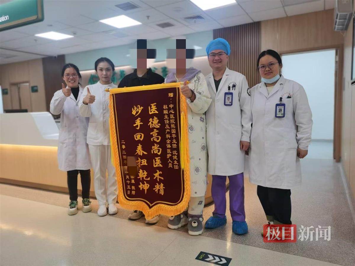 产妇和家属赠送锦旗感谢产科医护人员(武汉市中心医院供图)