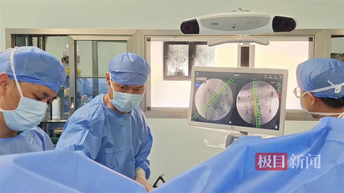 11月20日,手术在全麻下展开,根据规划的方案,在骨科手术导航系统的实时观测下,机器人配合医生找到准确位置,随着导针的深入,屏幕可以精确到亚毫米级的精度,实时显示导针的位置和角度、深度等信息。历时3分钟,导针精准植入规划部位,手术切口仅5毫米。近日,张先生回医院复查,恢复状态良好。