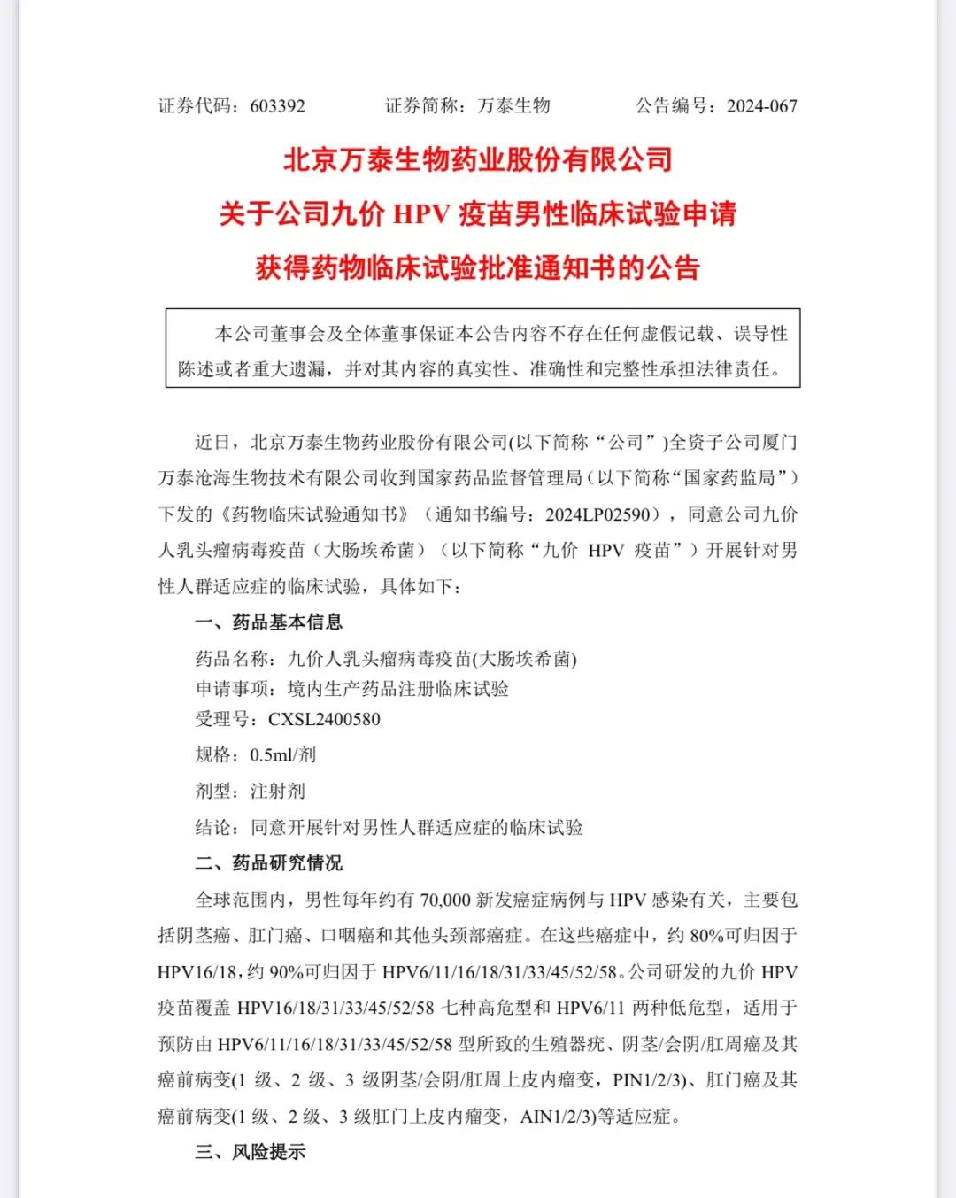 公开信息显示,去年9月,默沙东九价HPV疫苗提交的男性适应证上市申请,已获国家药监局受理。相关机构曾预测,该上市申请有望在今年至明年获批。