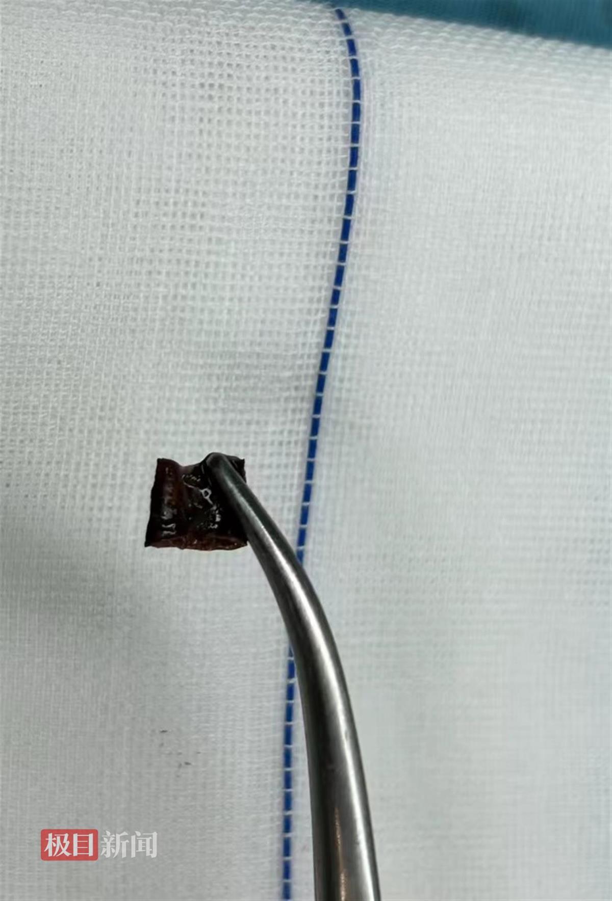 12月13日,手术顺利进行。术中,专家在右肺下叶支气管内截获了那块红色带黑的异物,辨认出那是一片2厘米长的辣椒皮。