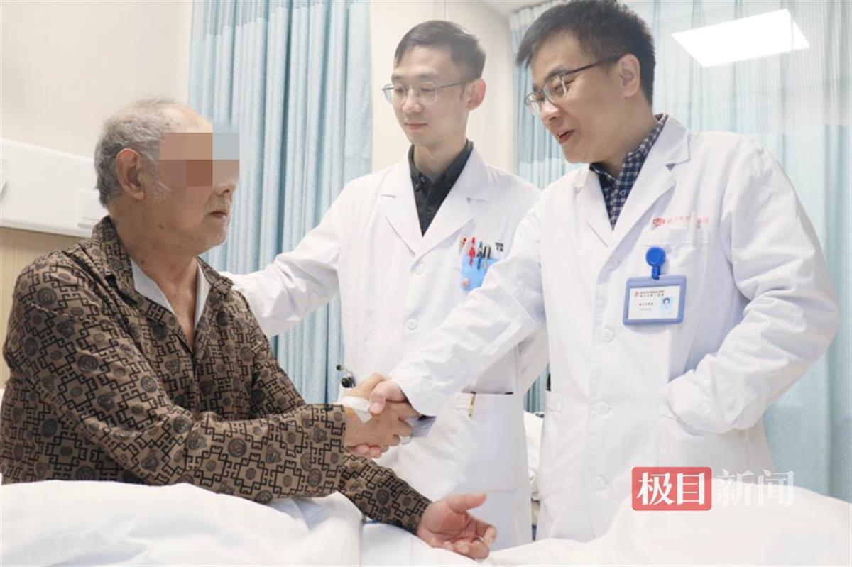 武汉市第一医院心血管内科病房,即将出院的汪先生与救治团队的医生们握手道别(通讯员代雨朦 摄)