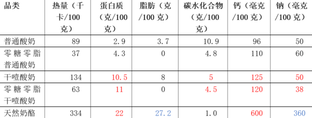从下表数据可以看到,干噎酸奶的蛋白质含量是普通酸奶的2.5~3.8倍,钙含量也比普通酸奶高12%~24%。即便是非零糖零脂的干噎酸奶,其碳水化合物含量也比普通酸奶低一半。