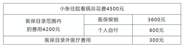 小张在医院住院看病,总花费4500元,其中纳入医保目录的医疗费用4200元,医保报销3600元,医保目录外医疗费用300元。