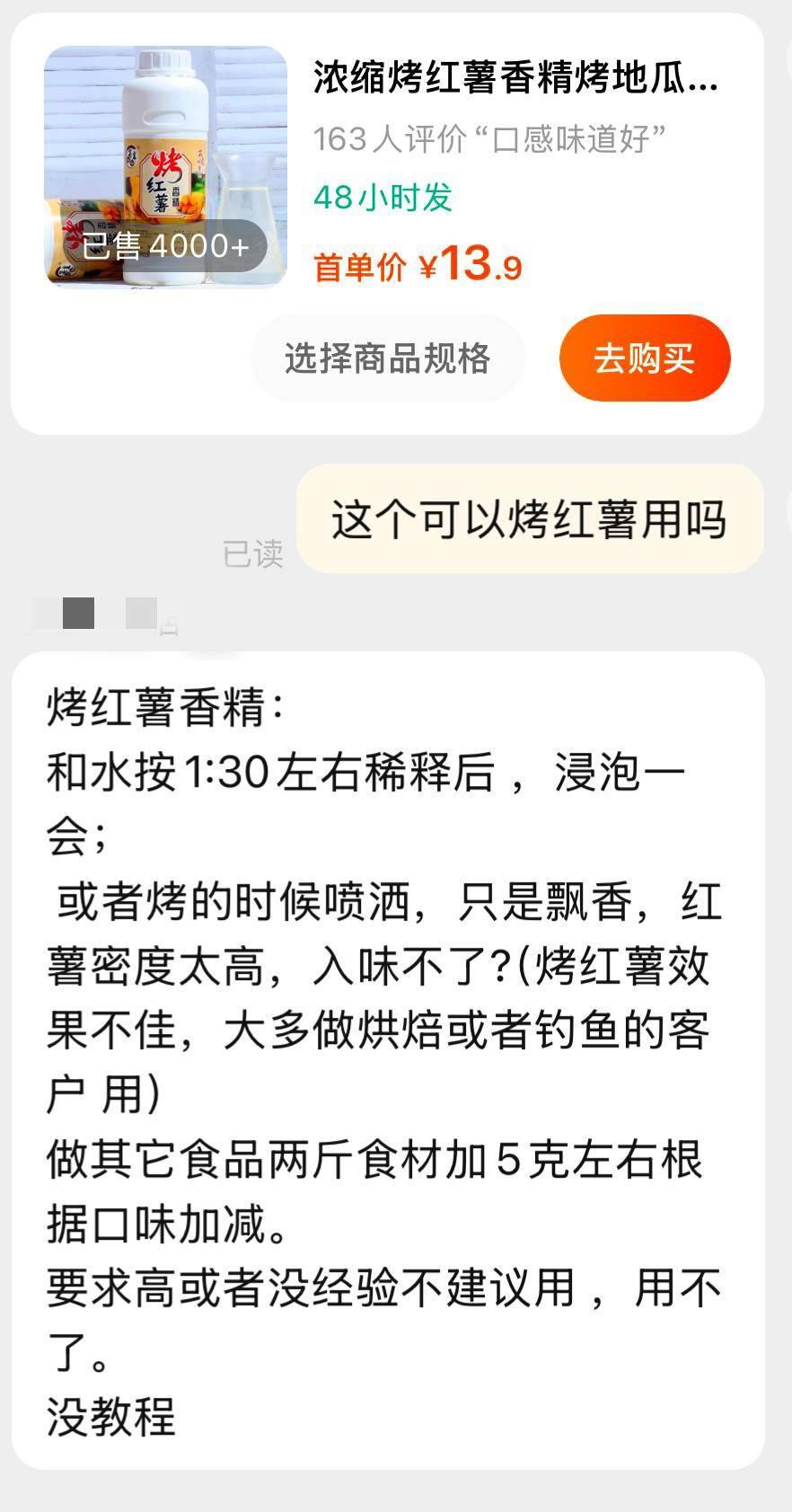 那它到底能不能用来烤红薯呢?店铺客服告诉记者,香精是食品级的,按比例稀释后,可以浸泡红薯或者喷洒在表皮。但客服提示,烤红薯效果不佳,因为红薯密度高,无法入味,只是起到飘香效果。大多客户购买是为了做烘焙或者钓鱼。