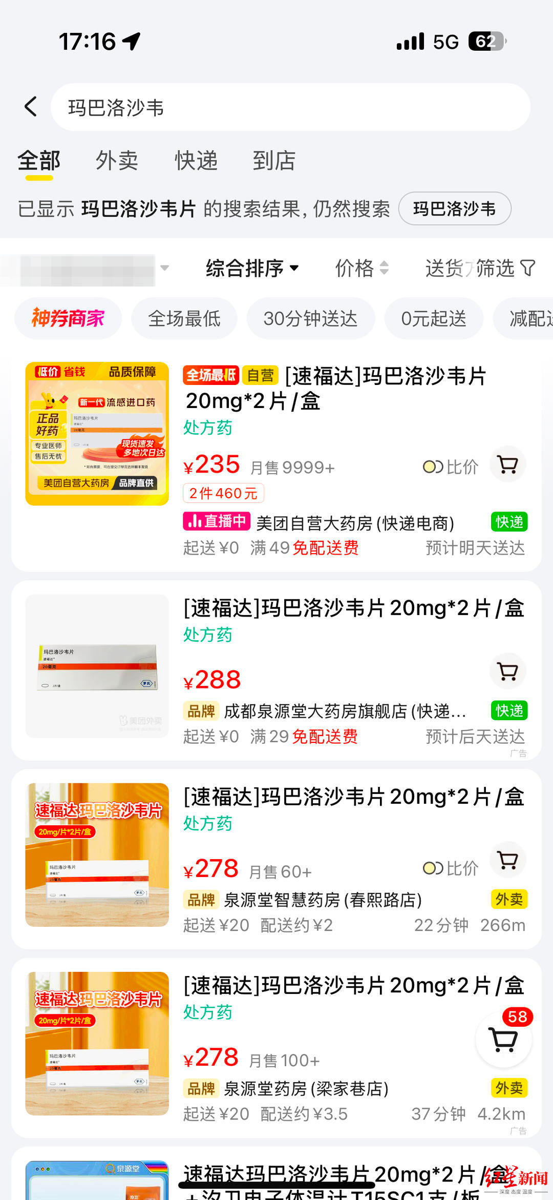 在美团买药平台上,多家药店的速福达显示库存充足,两片装的速福达价格从229元到288元不等。有药店表示,与速福达相比,80元6颗的奥司他韦价格更为亲民,但速福达吃一片便能缓解症状,“这也是很多人选择的原因。”
