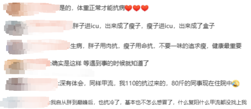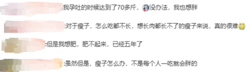 不过,也有一部分网友欲哭无泪:自己也知道保持正常的体重较健康,可无奈自己是易瘦体质,无论吃多少,就是胖不起来,臣妾真心做不到哇!