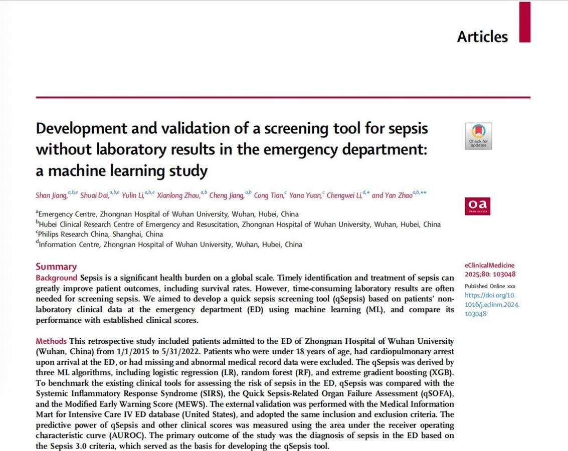 2025年1月,武汉大学中南医院急救中心赵剡教授研究团队在全球医学权威期刊《柳叶刀》子刊《eClinicalMedicine》发表了题为《Development and validation of a screening tool for sepsis without laboratory results in the emergency department:a machine learning study》的研究成果。这项研究开发了一种无需实验室检测即可快速筛查脓毒症的工具——qSepsis,为急诊科的脓毒症筛查带来了革命性改变。