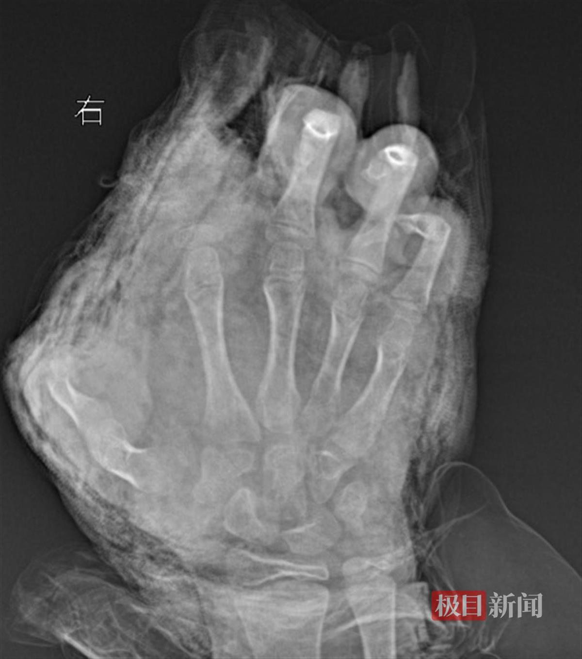 “孩子来院时,伤得触目惊心。”武汉市第四医院小儿创伤及矫形中心副主任医师徐剑介绍,初诊时看到明明双手血肉模糊,脸上和胸前均有炸裂伤,右手伤得最重,虎口处的伤口中还嵌入了小石子。经进一步检查发现,明明右手虎口处裂伤至手腕处,右手食指完全离断,拇指前段二分之一处被炸断,中指远节软组织缺损,环指和小指指腹炸伤严重。
