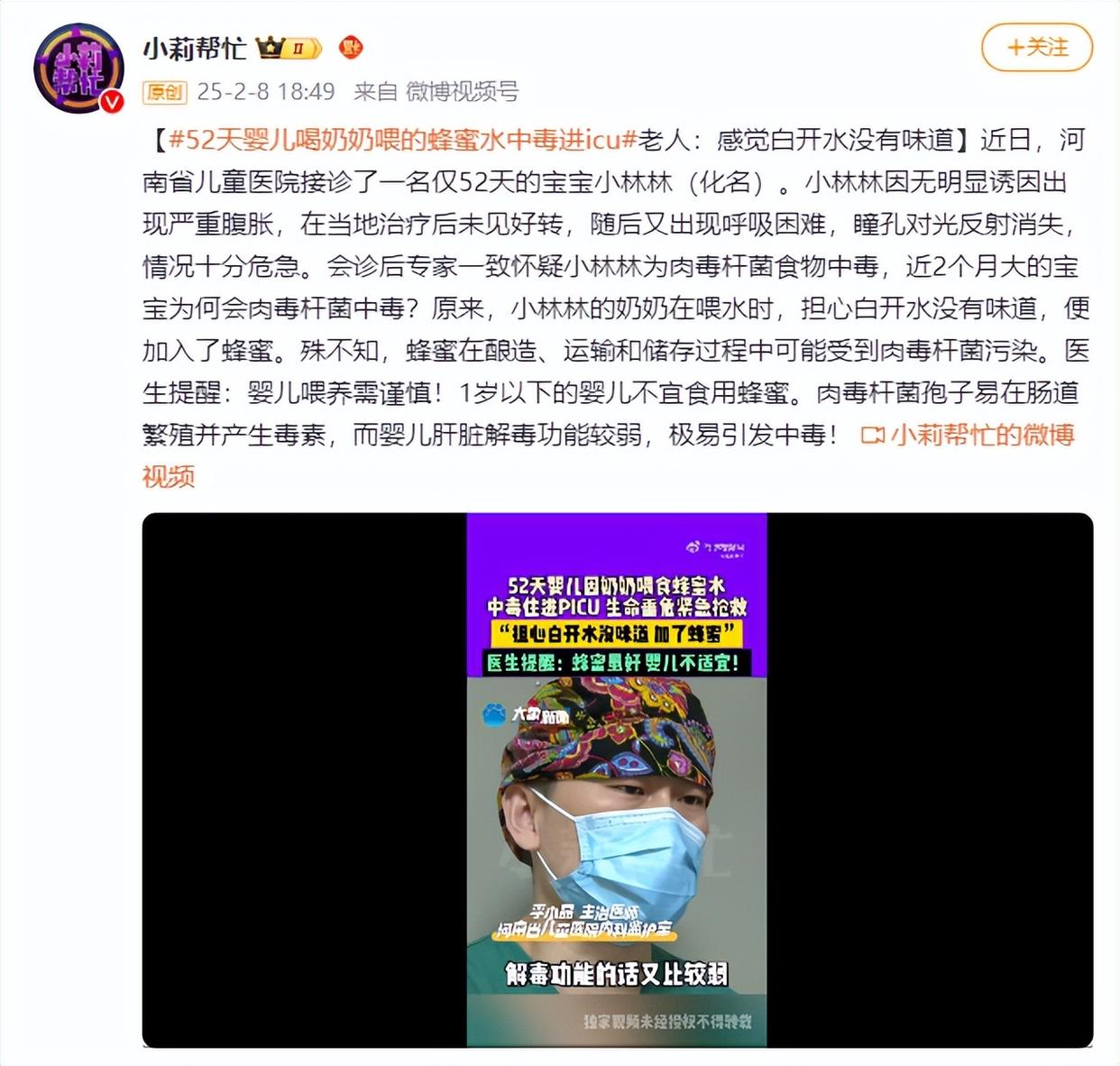 原来,小林林的奶奶在喂水时,担心白开水没有味道,便加入了蜂蜜。殊不知,蜂蜜在酿造、运输和储存过程中可能受到肉毒杆菌污染。医生提醒:婴儿喂养需谨慎!1岁以下的婴儿不宜食用蜂蜜。肉毒杆菌孢子易在肠道繁殖并产生毒素,而婴儿肝脏解毒功能较弱,极易引发中毒!