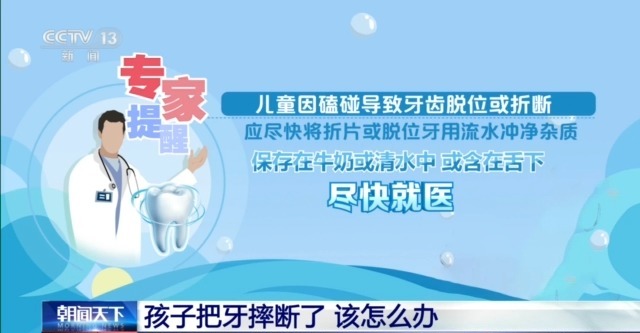 专家提醒,儿童因磕碰导致牙齿脱位或折断,应尽快将折片或脱位牙用流水冲净杂质,保存在牛奶或清水中,或含在舌下,尽快就医。