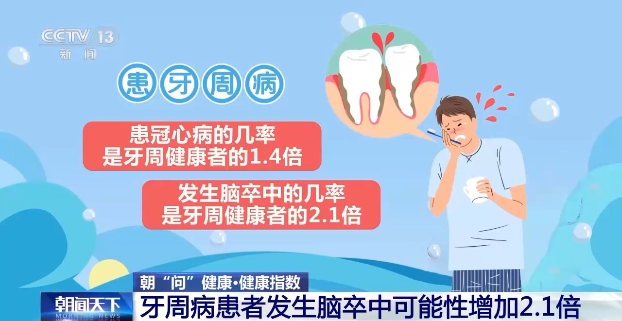 患牙周病的人,患冠心病的几率是牙周健康者的1.4倍,发生脑卒中的几率是牙周健康者的2.1倍。