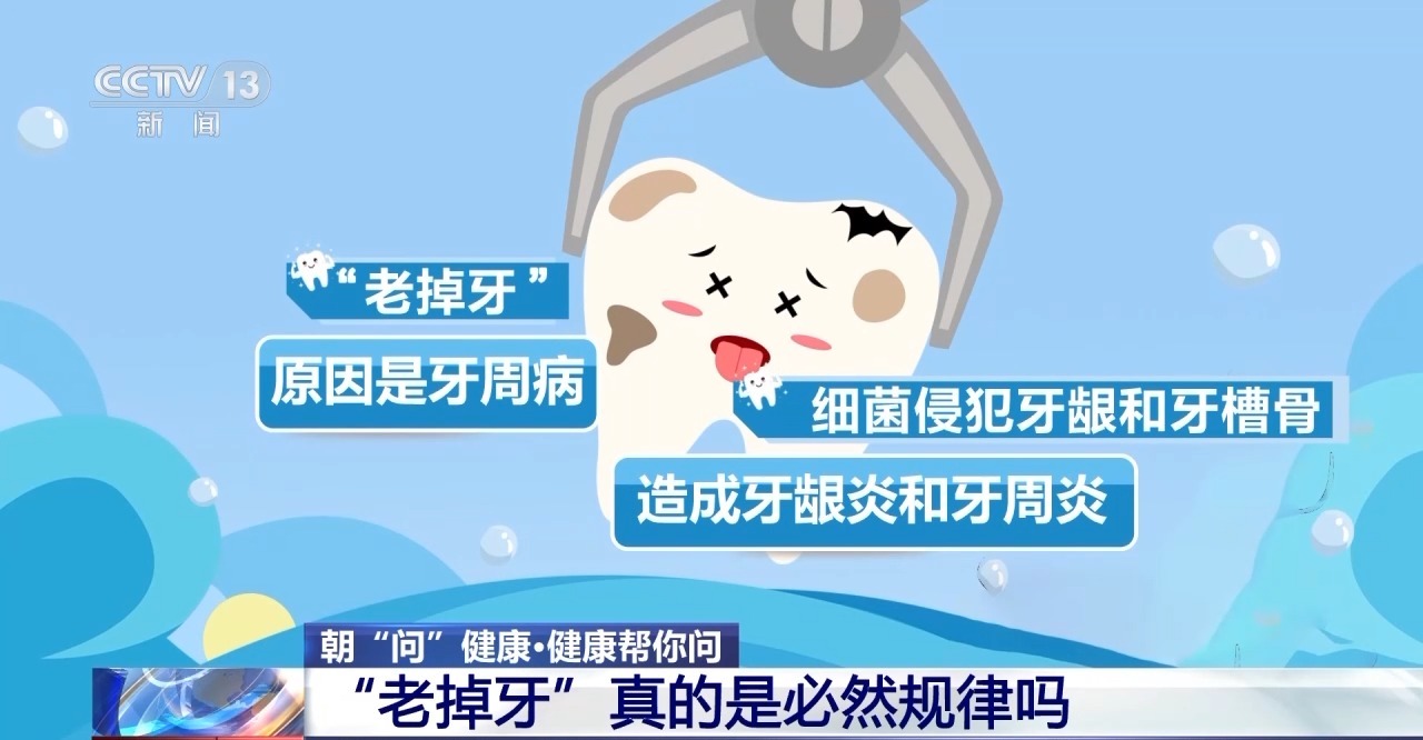 北京大学口腔医院综合二科副主任医师许桐楷:首先跟观众朋友们澄清一点,就是老掉牙并不是一个自然现象,也不是随着年龄增长或者衰老的一种正常表现,老掉牙都是长期牙病没有得到有效控制,然后一直积累到中老年以后发生的。