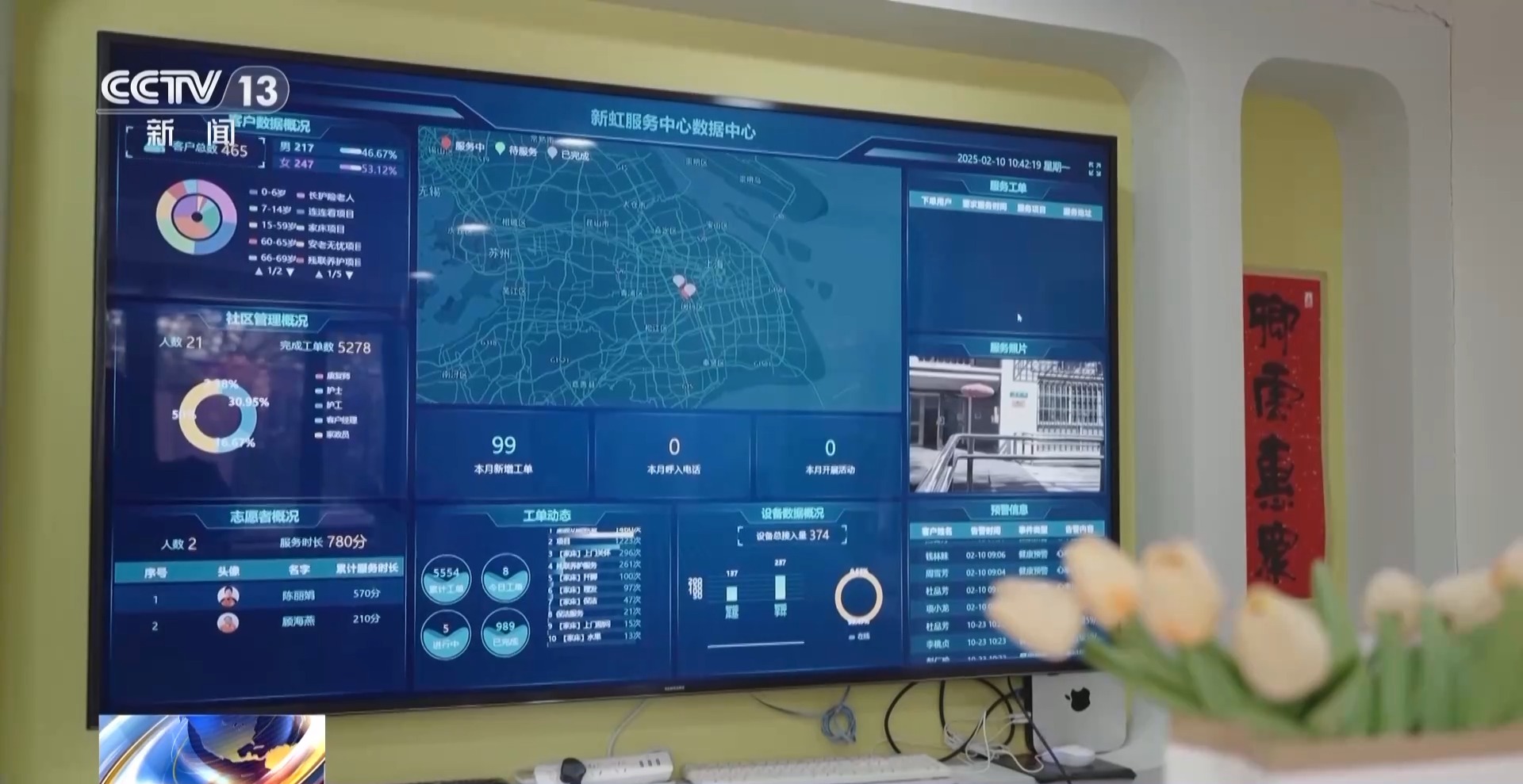 像上海闵行区就建立起了智慧养老服务平台,平台的信息大屏上实时监测着社区内数百位居家老人的健康情况,老人出现突发状况,工作人员会立刻处理。
