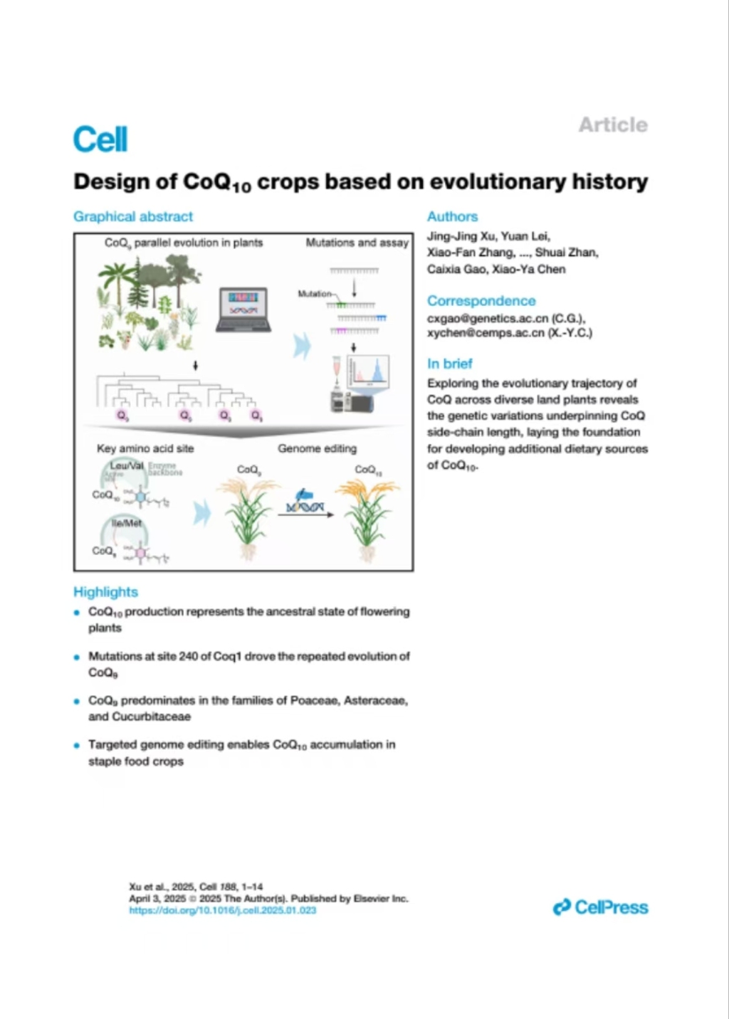 2月14日,中国科学院分子植物科学卓越创新中心辰山科学研究中心陈晓亚院士团队与中国科学院遗传与发育生物学研究所高彩霞团队联合攻关,在国际权威期刊Cell上在线发表了题为“Design of CoQ10crops based on evolutionary history(基于植物进化的辅酶Q10性状设计)”的科研论文。
