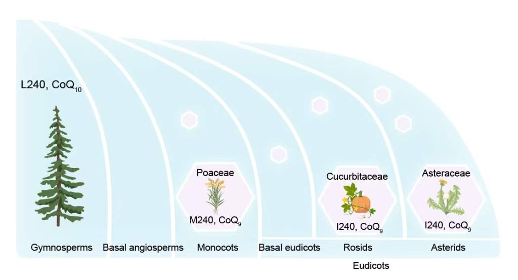 为什么不同物种合成的辅酶Q侧链长度不同?得益于上海辰山植物园丰富的植物资源,该团队采集了包括苔藓、石松、蕨类、裸子植物和被子植物在内的共67个科134种植物样品。检测各物种辅酶Q类型及系统分布特征,发现辅酶Q10是被子植物的祖先性状,多数植物仍然合成辅酶Q10,而禾本科、菊科和葫芦科植物等主要合成辅酶Q9。