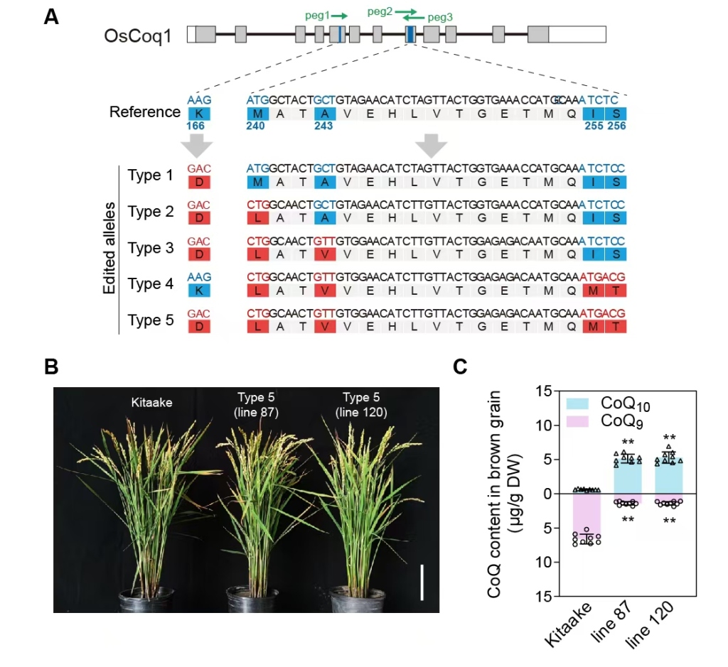 要精准改造农作物性状,创造高营养品质,首先要精确锚定性状形成的关键因子。结合对1000多种陆生植物辅酶Q侧链合成酶Coq1氨基酸序列的进化分析和机器学习,科研团队最终确定了决定链长的5个氨基酸位点。通过精准编辑,创制了主要合成辅酶Q10的水稻,其叶片和籽粒中辅酶Q10占总辅酶Q的75%,籽粒中辅酶Q10达5 μg/g,且对水稻产量没有影响。