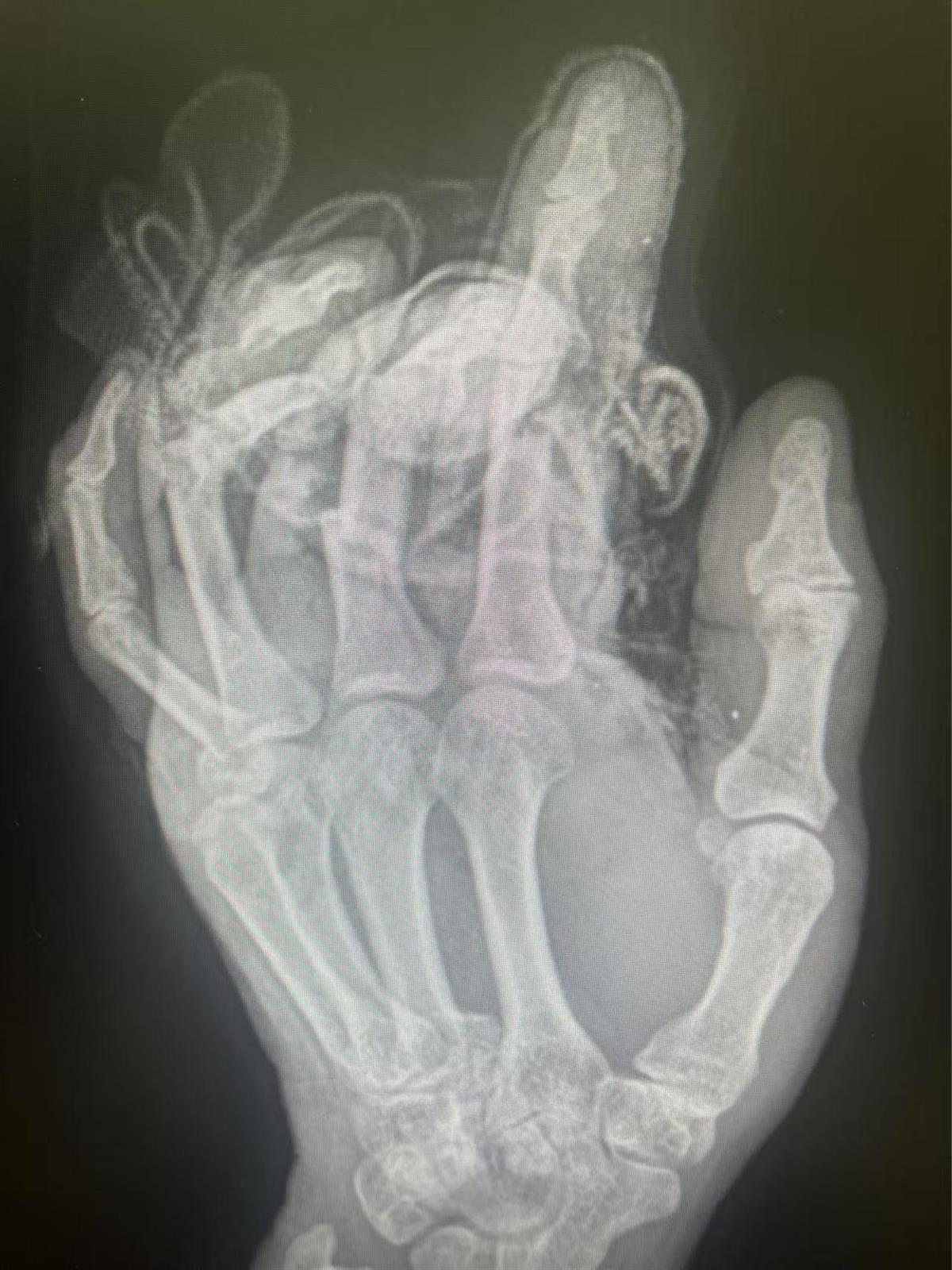 13日凌晨一点,47岁的张师傅(化姓)在生产包装盒的工厂内上夜班,一不小心,戴着手套的左手被卷入机器中,抽出时已是血肉模糊,手套连着手被机器绞成了多段。简单包扎后张师傅在工友的陪同下赶往武汉市第四医院。“患者来院时接近凌晨三点,因出血量太大,担心造成出血性休克,一边进行止血处理,一边迅速将患者转到手术室开展再植手术。”接诊的手、显微及修复重建外科中心副主任医师陈焱介绍,患者的左手食中环小指多处指骨开放性粉碎性骨折,血管、神经以及肌腱全部断裂。