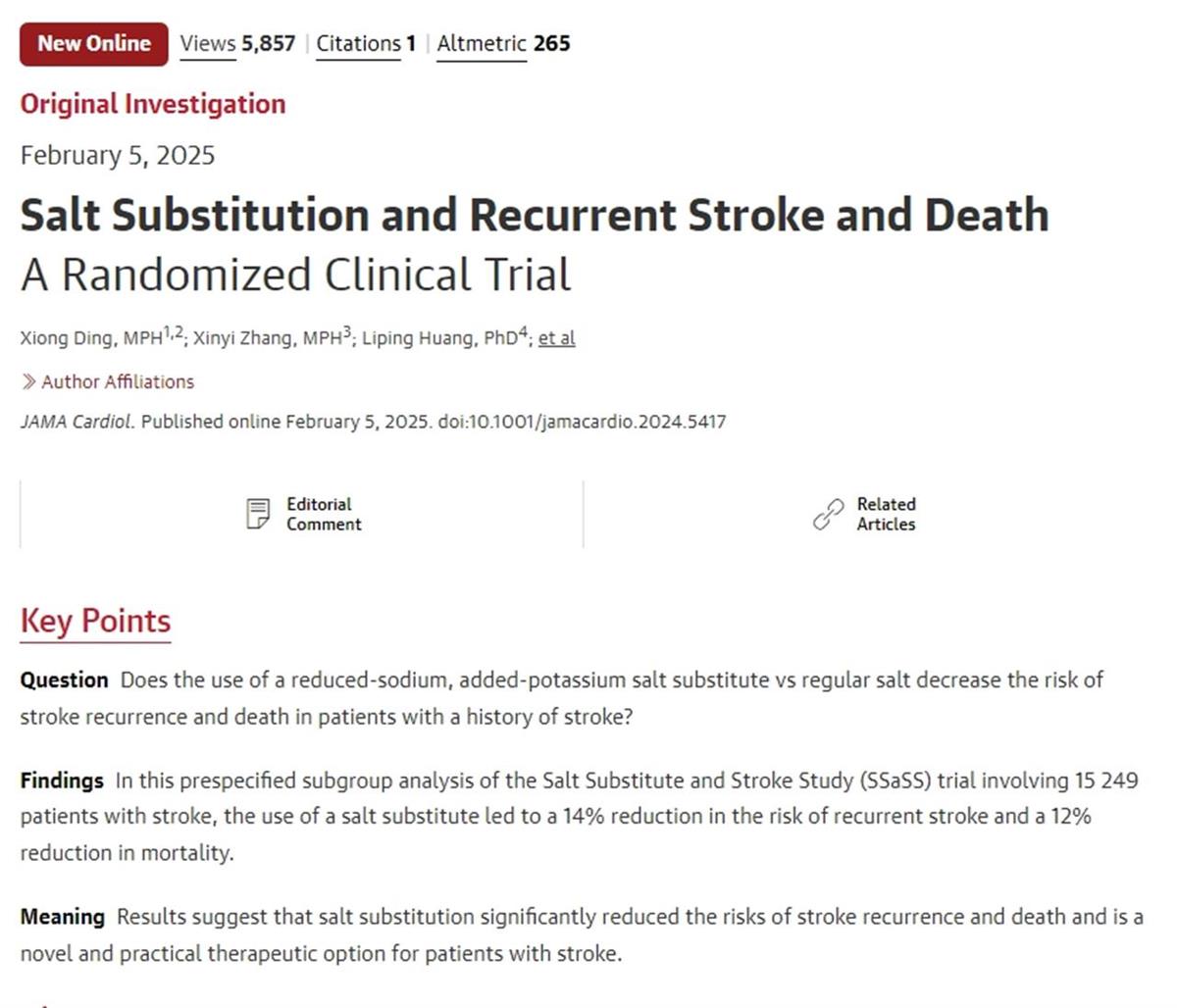 武汉大学公共卫生学院联合昆山杜克大学全球健康研究中心、哈尔滨医科大学公共卫生学院的研究人员的一项研究发现,脑卒中患者用低钠盐(含75%氯化钠和25%氯化钾)替换普通盐,可降低脑卒中复发和全因死亡风险。2025年2月5日,相关研究成果发表在心血管领域国际期刊《美国医学会杂志》上。