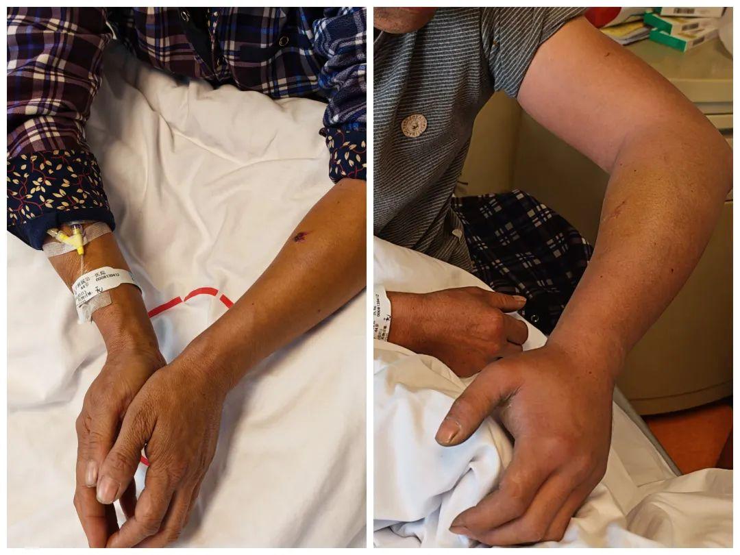左图为用完血清恢复后,右图为刚入院时胳膊肿胀