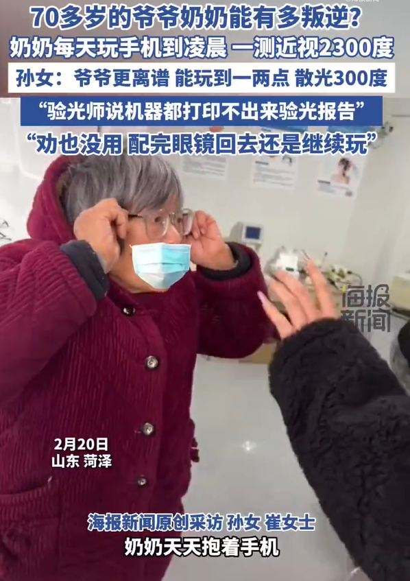 据海报新闻2月20日报道,山东菏泽,一位70多岁的奶奶每天玩手机到凌晨,一测近视2300度。孙女称爷爷奶奶每天睁开眼就是玩手机,一直玩到深夜,爷爷更离谱,每天玩手机玩到一两点,家人劝也劝不动,机器都打不出验光结果。
