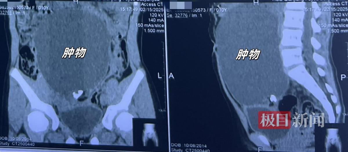 据了解,琪琪从2024年12月起出现持续性腹痛、便秘、食欲减退等症状,家长起初以为只是普通的胃肠道问题,便给她使用了开塞露。过了一段时间,琪琪的腹痛和便秘并没有缓解,小腹还明显鼓了起来。到当地医院一检查,超声结果显示她的盆腔内有一个直径约15厘米的巨大肿物。由于病情复杂,当地医院建议转诊至湖北省肿瘤医院进行治疗。