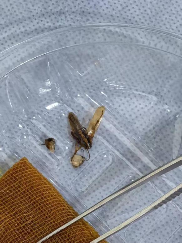 李伟杰一边安抚王女士的情绪,一边向王女士的耳道内滴入适量的温生理盐水进行处理。待小蟑螂的活动减弱后,李伟杰使用专业耳道异物钳,精准地将蟑螂完整取出。王女士表示,医生的动作又快又稳,从挂号到处理完毕,大概用了十分钟。