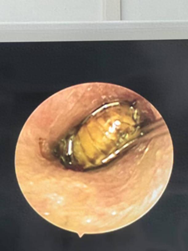 值班医生李伟杰随即为王女士进行耳道检查,这一看吓一跳!竟然有一只活的小蟑螂蜷缩王女士的耳道深处。
