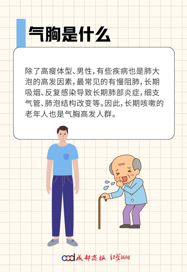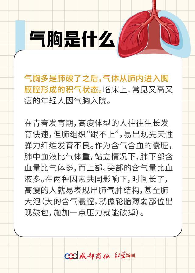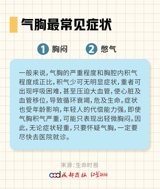 气胸最常见症状是胸闷、憋气。一般来说,气胸的严重程度和胸腔内积气程度成正比,积气少可无明显症状,重者可出现呼吸困难,甚至压迫大血管,使心脏及血管移位,导致循环衰竭,危及生命。症状也受年龄影响,年轻人的代偿能力强,即使气胸积气严重,可能只表现出轻微胸闷。因此,无论症状轻重,只要怀疑气胸,一定要尽快去医院就诊。