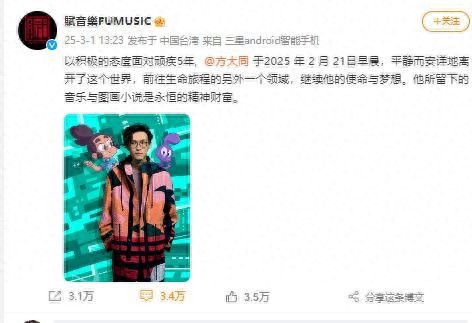 3月1日,赋音乐有限公司发布消息,以积极的态度面对顽疾5年, 歌手方大同于2025年2月21日早晨,平静而安详地离开了这个世界,前往生命旅程的另外一个领域,继续他的使命与梦想。他所留下的音乐与图画小说是永恒的精神财富。