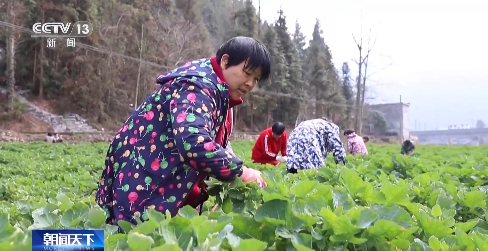 清晨的云南大理巍山坝子田间,露水还未散去,基地的工人们掐下头茬鲜嫩的板蓝根菜。