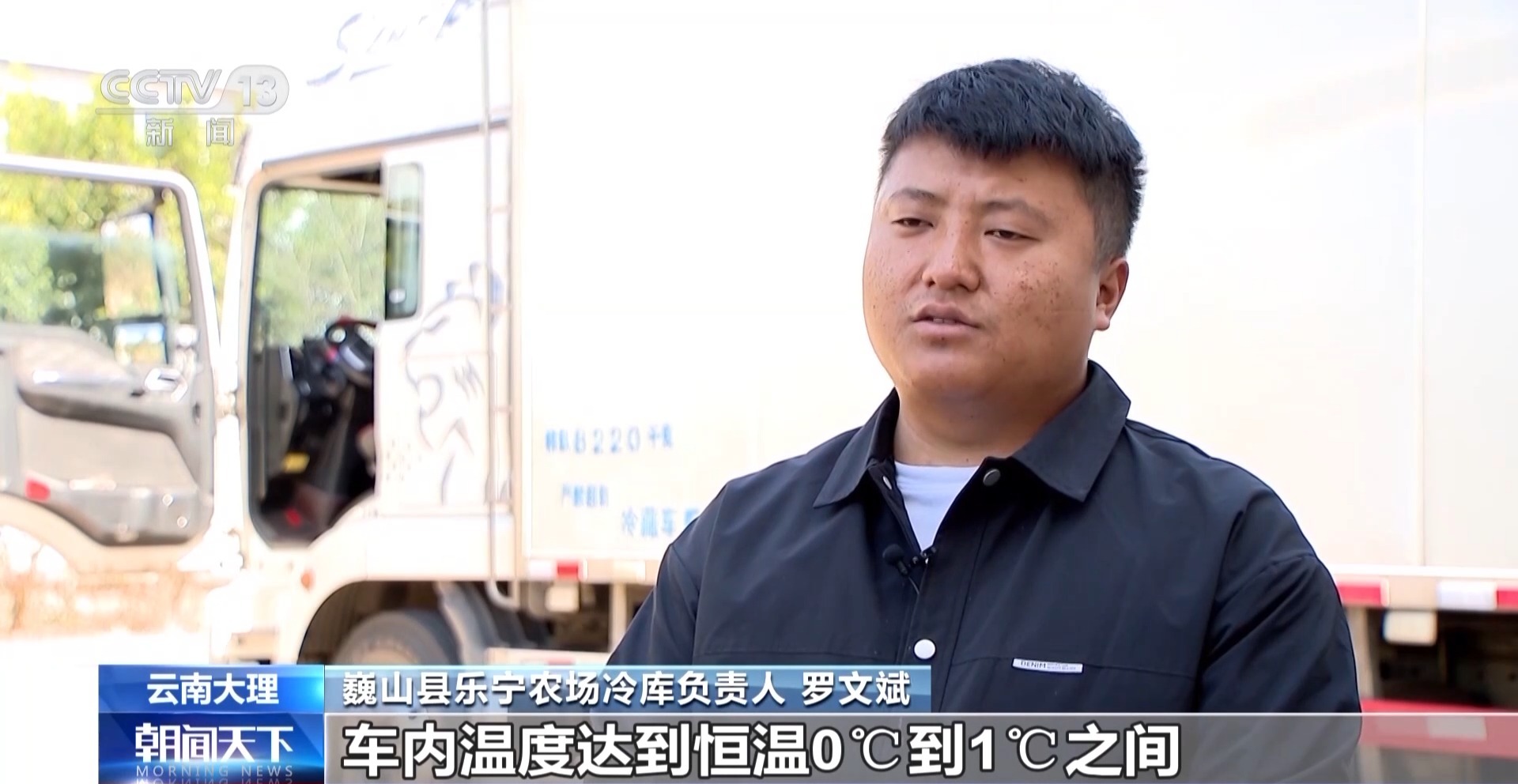 巍山县乐宁农场冷库负责人罗文斌:车内温度达到恒温0℃到1℃之间,车上配备了GPS定位和温度追踪,实时定位。