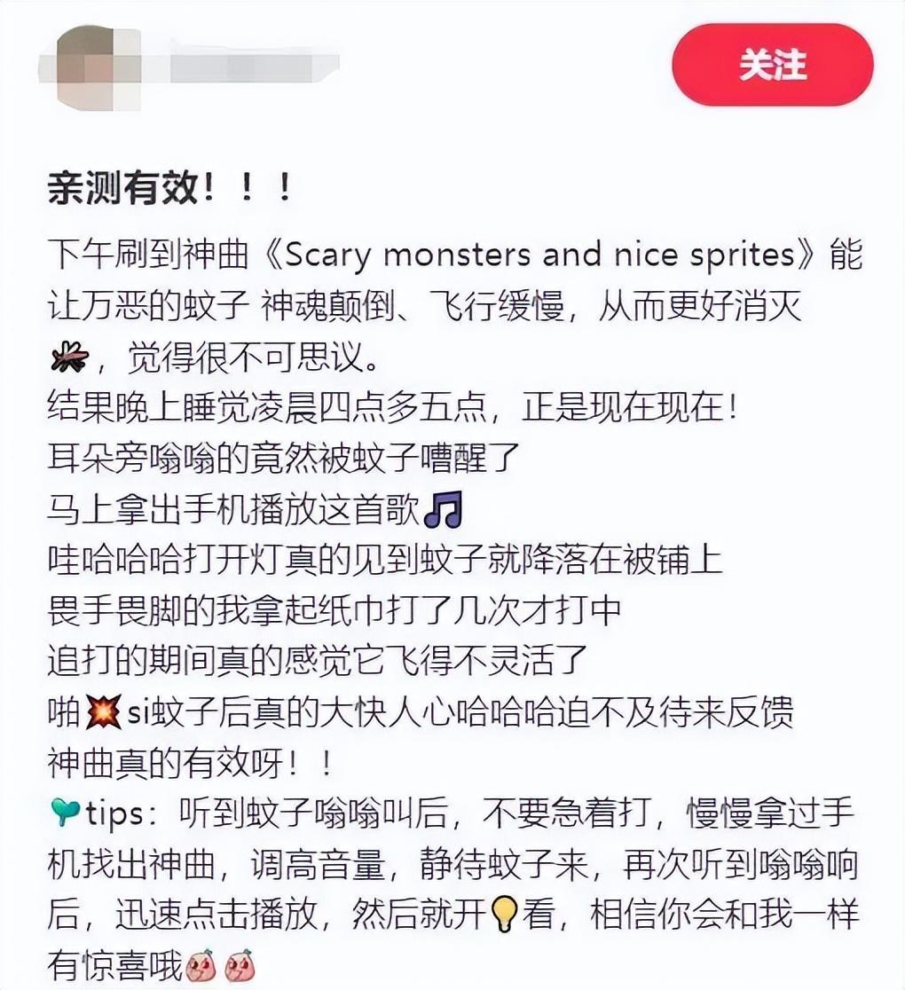 据悉,早前有研究发现,通过音箱大声外放电子乐《Scary Monsters and Nice Sprites》确实在一定程度上会影响蚊子对于猎物的判断,使进食次数和交配频率都明显下降了。
