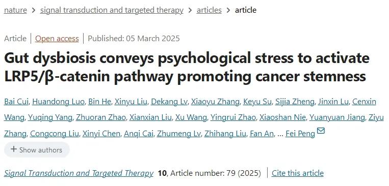 来自大连医科大学肿瘤干细胞研究院、大连医科大学附属第二医院的研究团队,在著名期刊《信号转导与靶向治疗》刊文称,心理压力会促进乳腺癌细胞往驱动肿瘤发生、转移、耐药和复发的癌症干样细胞发展。在压力促进肿瘤生长和癌症干样状态的过程中,肠道微生物发挥着重要的作用。
