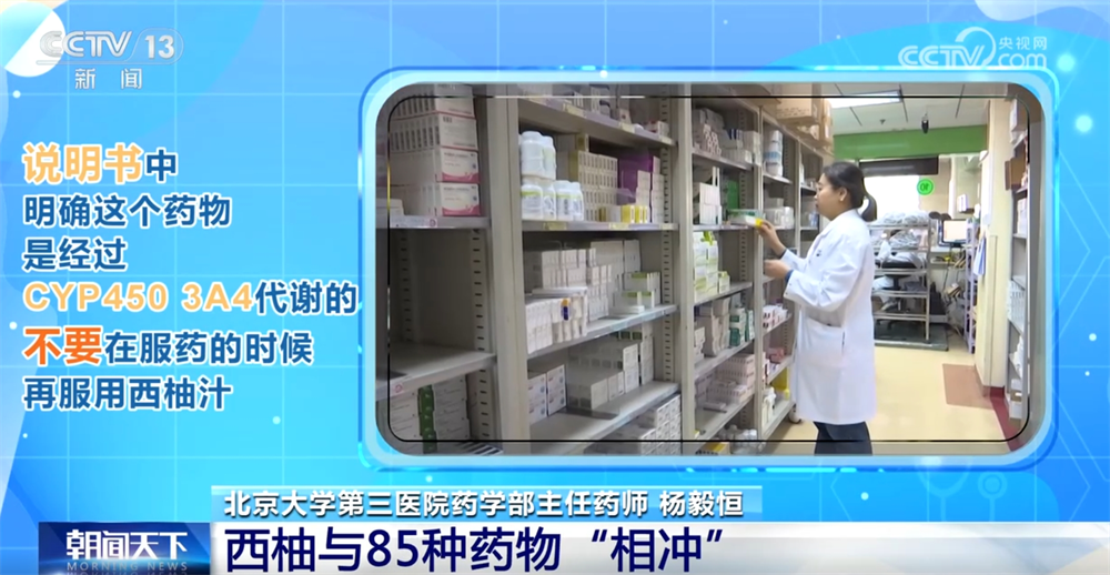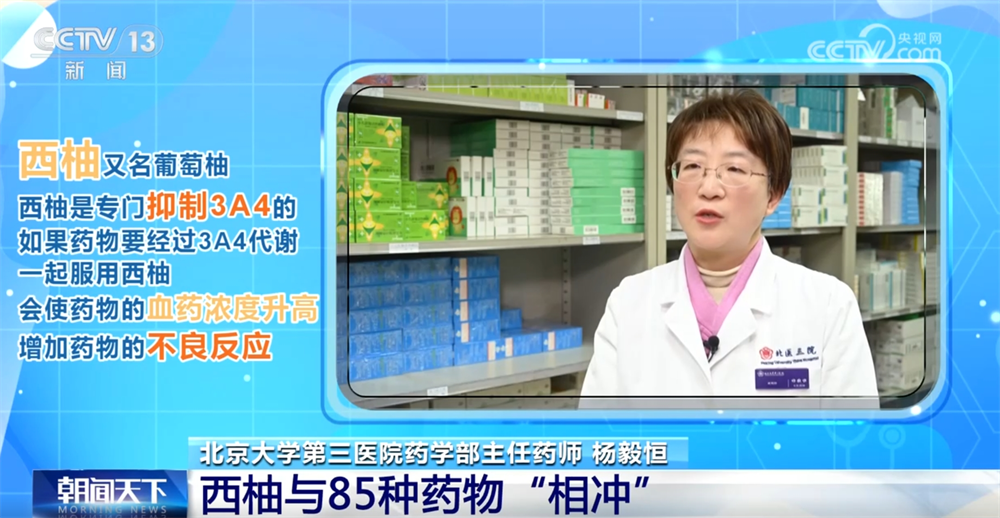 北京大学第三医院药学部主任药师杨毅恒称:“西柚又名葡萄柚,西柚是专门抑制3A4的,所以如果我们的药物是要经过3A4代谢的,这时候如果一起服用西柚,就会使药物的血药浓度升高,增加药物的不良反应。至少有超过85种药物可以和西柚汁产生相互作用,其中有一半的这些药物它的相互作用会导致严重的不良反应。”