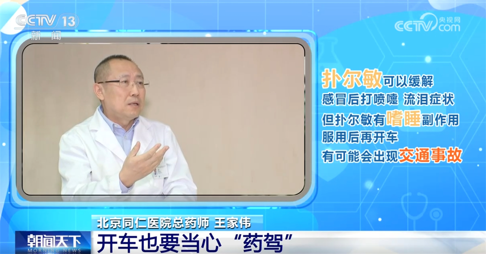 北京同仁医院总药师王家伟称:“感冒以后有打喷嚏、流泪,用扑尔敏是缓解症状的表现,但是扑尔敏有一个非常大的副作用,就是嗜睡,你再开车就有可能会出现交通事故。再就是镇静催眠类的,晚上吃了以后对睡眠是有好处的,但有些药物它有后遗效应,就早上起来还有头昏沉、头晕这种情况。”