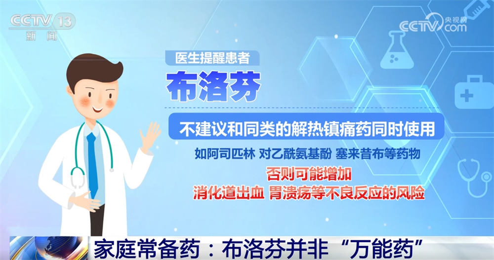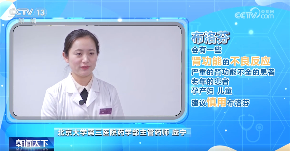 庞宁称:“因为它会有一些肾功能的不良反应,所以对于一些严重的肾功能不全的患者,还有老年的患者以及孕产妇、儿童,我们是建议慎用布洛芬。对于一些儿童,特别是年龄小于6个月的孩子是不建议使用布洛芬的。还有比如说一些溃疡的出血史患者,还有一些脑出血史的患者,我们也是不建议使用的。”